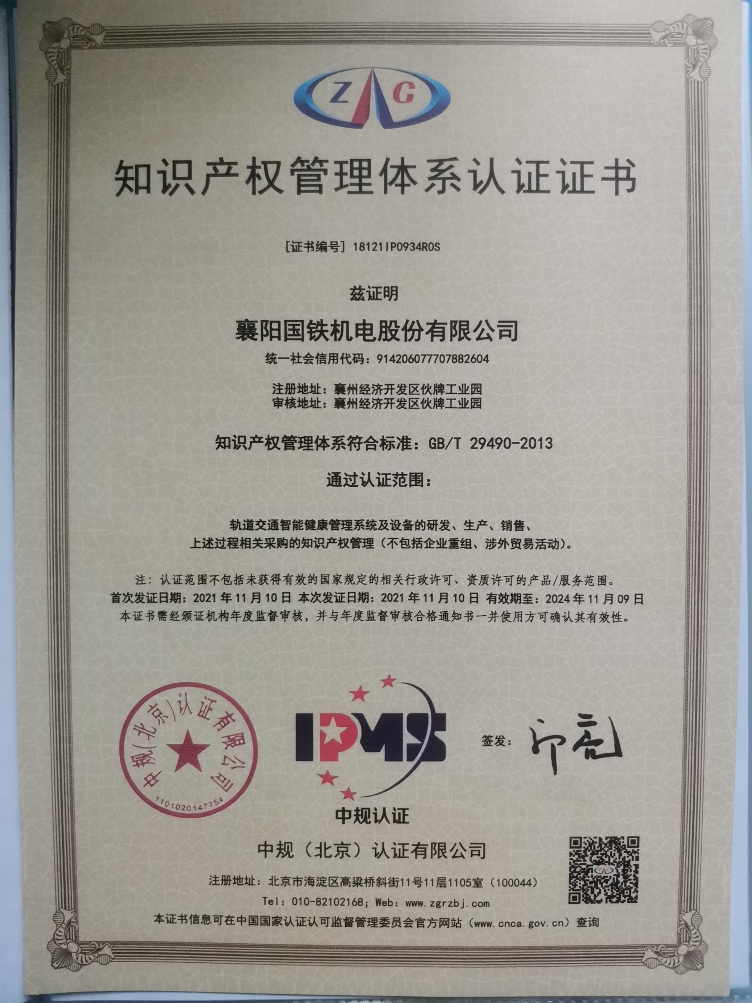 知識(shí)產(chǎn)權(quán)管理體系認(rèn)證證書